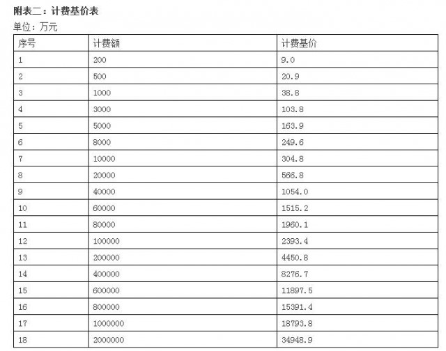 注:計(jì)費(fèi)額>2000000萬(wàn)元的,以計(jì)費(fèi)額乘以1.6%的計(jì)費(fèi)率計(jì)算計(jì)費(fèi)基價(jià)。