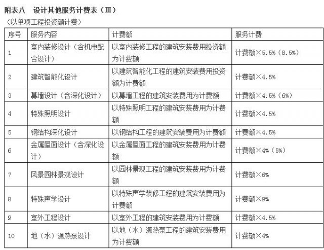 3.2 設(shè)計(jì)服務(wù)可采用以投資費(fèi)率方式計(jì)費(fèi),也可在部分項(xiàng)目上以投資費(fèi)率為參照,采用單位建筑面積方式計(jì)費(fèi)或以工日定額方式計(jì)費(fèi),具體由發(fā)包人與設(shè)計(jì)人協(xié)商確定。