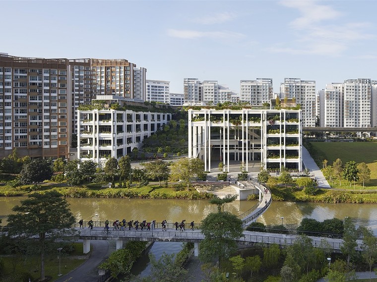 朝向水岸的風雨廣場是社區(qū)中充滿活力的核心地帶,可以用于各種類型的社區(qū)活動和事件。廣場連接了貫穿場地的東西向和南北向道路,同時與附近的Oasis輕軌站相連接,從而成為社區(qū)中重要的交通節(jié)點。建筑的每個立面都充斥著綠植,與環(huán)繞在餐廳和醫(yī)院外部的涼廊共同在室內(nèi)和室外之間形成一層“濾網(wǎng)”,使陽光和自然風柔和地透入內(nèi)部空間,從而讓整個建筑呈現(xiàn)出一種輕盈而開放的感覺。思銳建筑事務所的主創(chuàng)建筑師Christopher Lee表示:“我們的設計借鑒了新加坡住房和發(fā)展委員會在上世紀70-80年代開發(fā)的住宅建筑中常見的開放式框架,并基于景觀環(huán)境將這種框架轉(zhuǎn)變?yōu)橐粋€更加輕盈和開放的、能夠捕捉和容納各類社區(qū)功能的系統(tǒng)——這是一座為社區(qū)生活的展開而打造的建筑?!?/P>