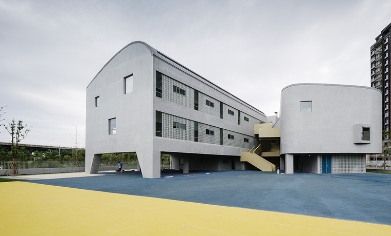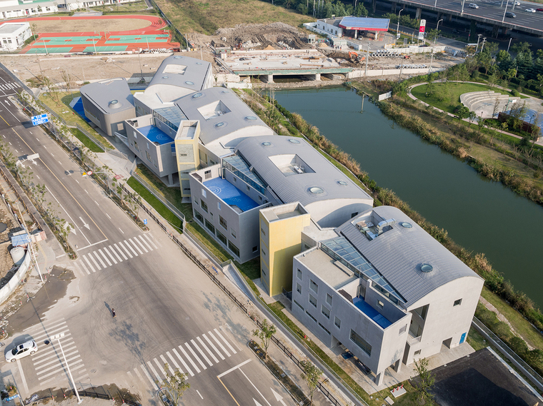 幼兒園是孩子們在成長過程中第一個接觸的公共空間。空間的尺度、使用的靈活度以及室內(nèi)的場景和氛圍,對于幼兒的感受和認知都有很大影響,對于建筑師也是一個挑戰(zhàn)。設計要能激發(fā)孩子們探索和學習的興趣,同時要給他們足夠的安全感,要有家的感覺。在調(diào)研期間,設計團隊也發(fā)現(xiàn),非正式空間-如活動室前的走廊-往往是孩子們生活、交往、嬉戲的重要場所。功能、空間與環(huán)境的關系,是本案在設計初始所面臨的主要矛盾和核心議題。張江萬科實驗幼兒園位于一個狹長的三角形地塊?;啬蟼?cè)為中環(huán)路高架與河道綠化,北側(cè)為高層住宅區(qū),東側(cè)為一座跨河道的車行橋,西側(cè)則為一棟需要容納在場地內(nèi)的區(qū)域環(huán)網(wǎng)站。要做出一個回應場地限制條件并符合教育局規(guī)范標準的15個班全日制幼兒園,這塊特殊的基地便顯得極具挑戰(zhàn)性。建筑師需要在滿足規(guī)劃指標、使用面積、規(guī)范性、安全性等硬性要求的前提下,在一個相對局促的場地里,創(chuàng)造出符合老師教學管理、誘發(fā)兒童探索心理、和滿足家長預期的幼兒園。