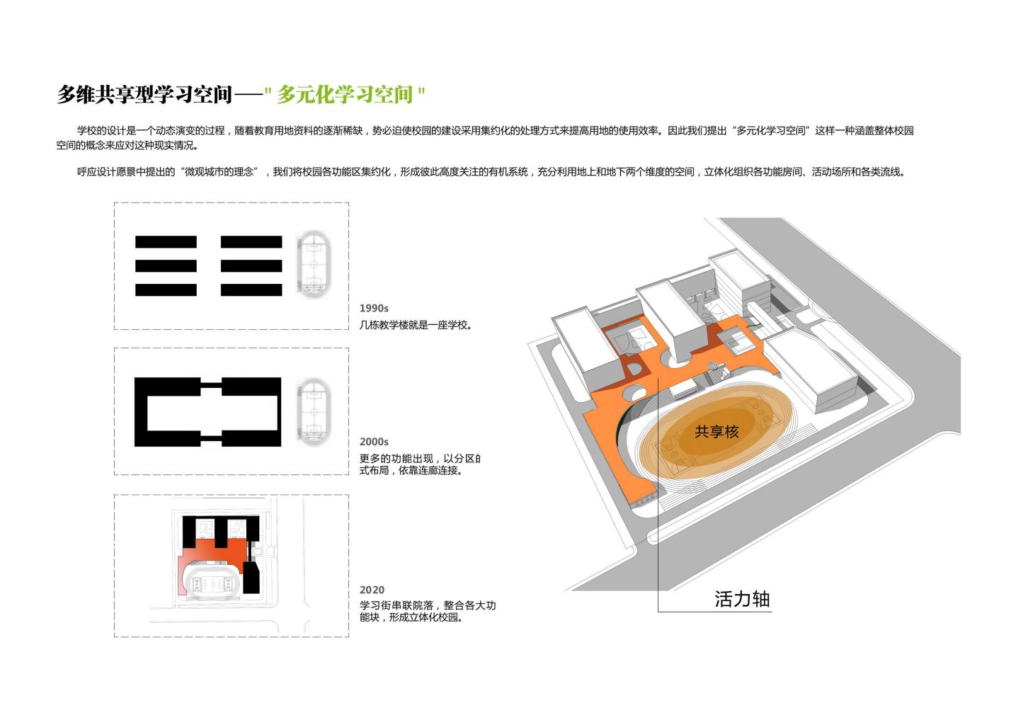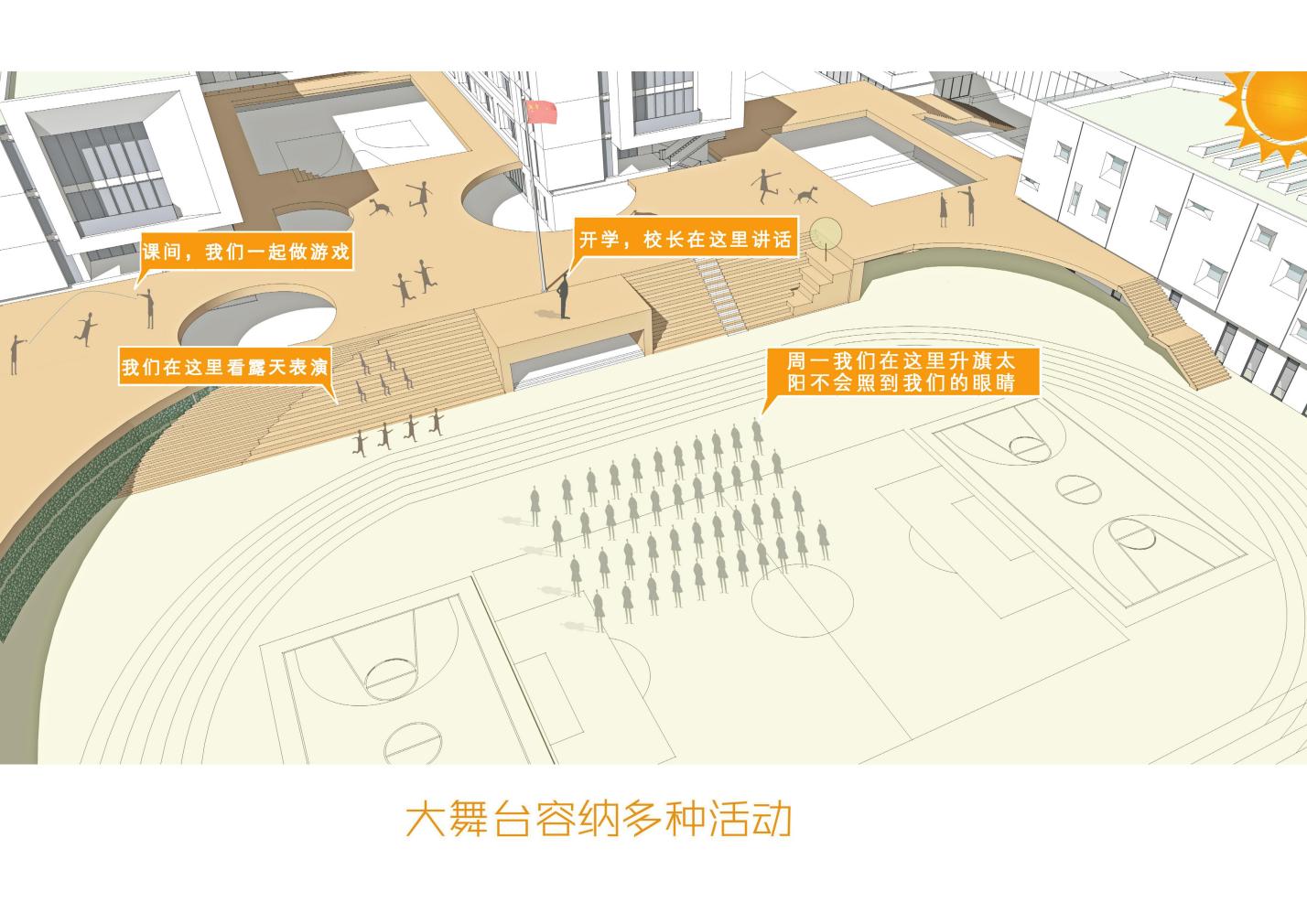 “雙首層”概念是將學校地上中心部分,局部進行一層架空懷抱住操場,架空平臺按照一半面積計算為1100平方,平臺上設置多個采光井,與景觀設計融為一體,形成學生的二層活動空間,與教師增加更多學習交流的互動空間,平臺下設置了功能房間,一個400平圖書閱覽室,2個音樂教室,1個舞蹈教室,一個體育器材室以及公廁。也形成了學生的一層活動空間,這樣解決了學生多活動場地少的難題,也解決了舞蹈音樂教室對普通教室教學引起的噪音污染問題。