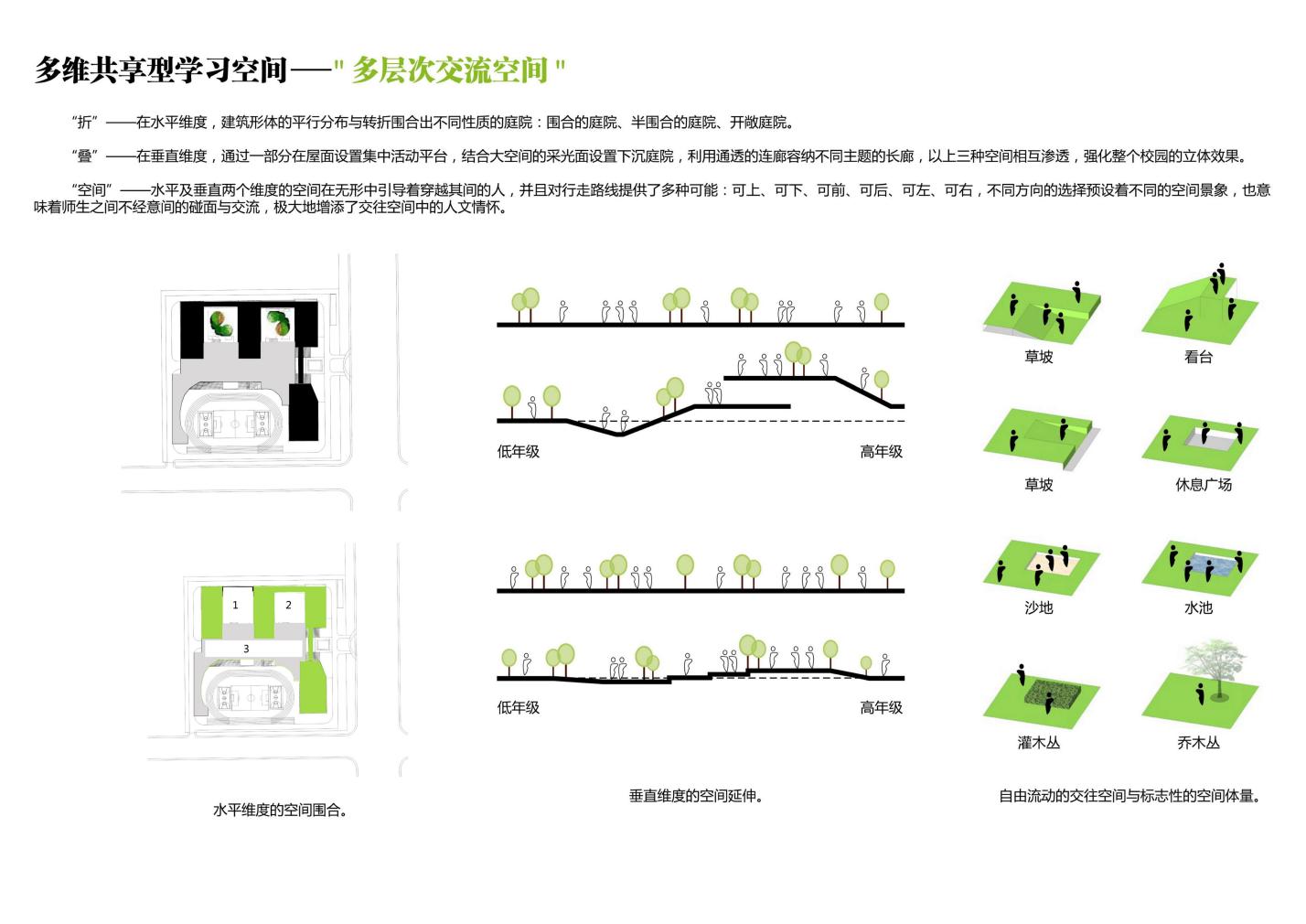 因本學校規(guī)模的班額較多,土地資源緊張,為了提高用地的使用效率,我們利用了地上以及地下的兩個空間,提出“雙首層”以及“雙地下”的概念,形成地上雙層以及地下雙層四個維度的空間,立體化的組織學校內(nèi)各功能房間,活動場所以及各類流線。